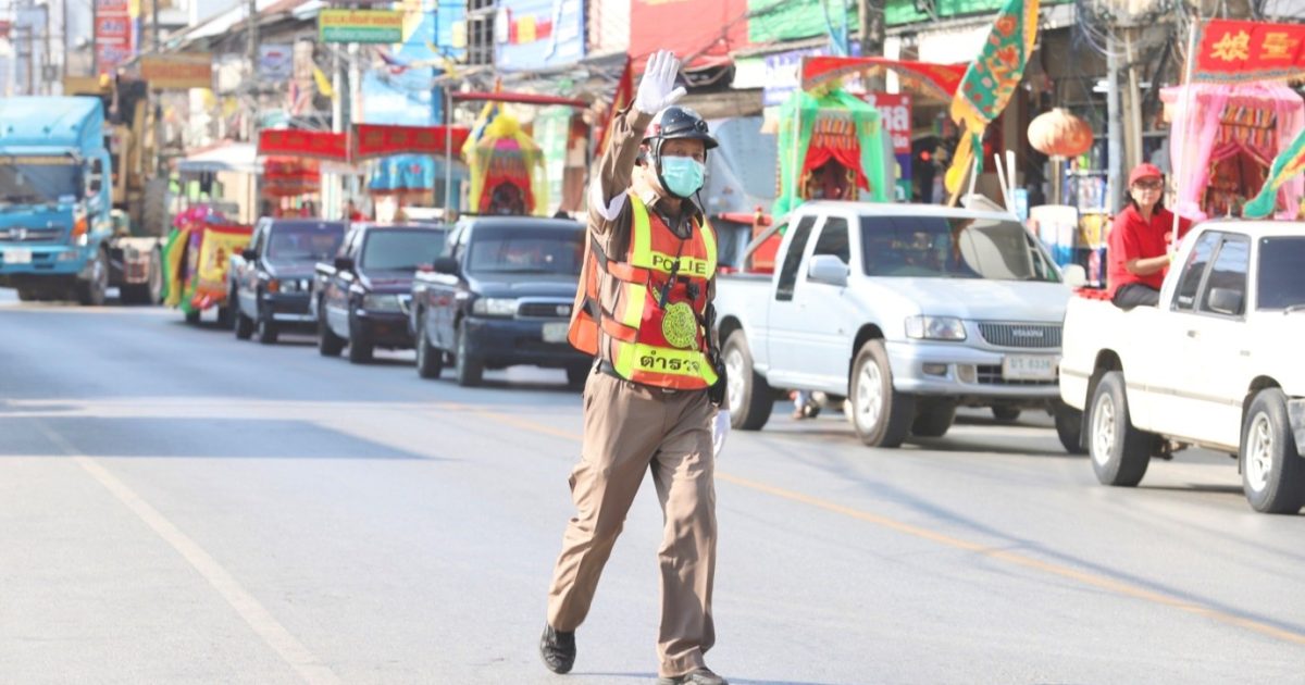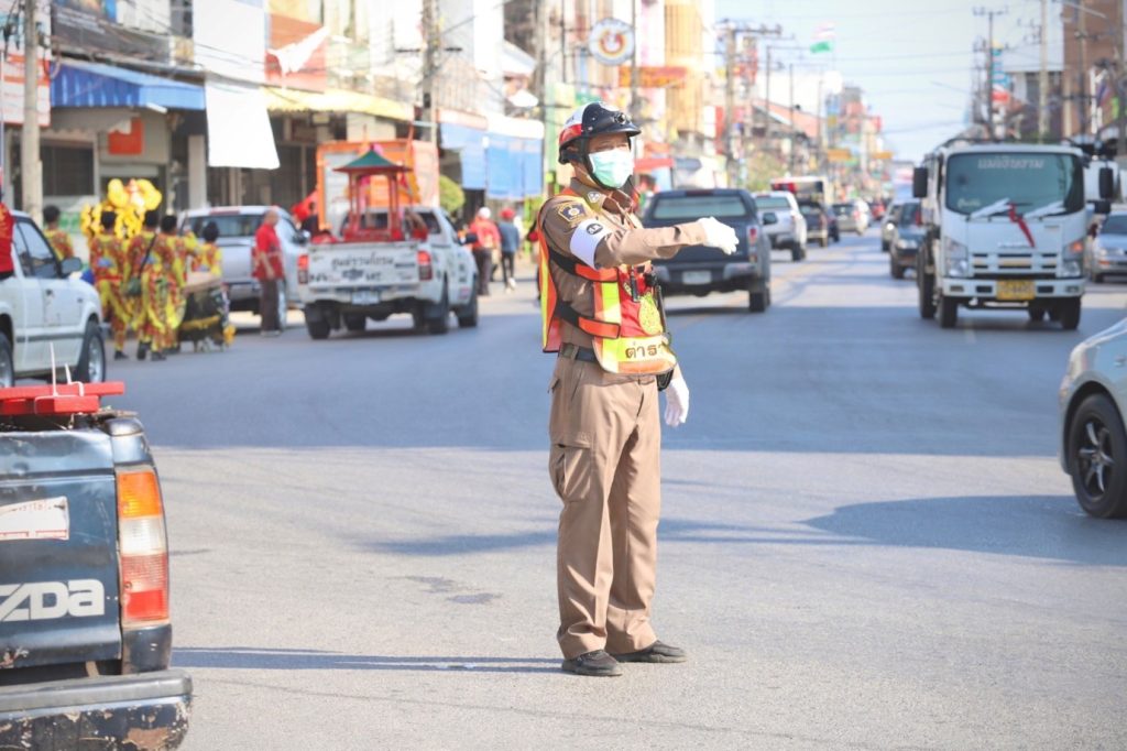 ร.ต.อ.สมโภชน์ คงนาน รอง สว.จร.สภ.สวรรคโลก พร้อมกับสายตรวจจราจร ปฎิบัติหน้าที่อำนวยความสะดวกด้านการจราจรขบวนแห่ ขบวนศาลเจ้าแม่ทับทิมริมยม เพื่อให้ประชาชน สักการะกราบไหว้ รอบตลาดสวรรคโลก