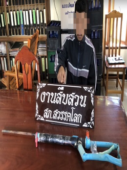 จับกุมผู้ต้องหา 1 ราย อยู่บ้านเลขที่ 44 ม.3 ต.เมืองบางยม อ.สวรรคโลก จ.สุโขทัย พร้อมด้วยของกลาง อาวุธ