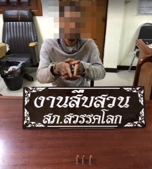 จับกุมผู้ต้องหา 1 ราย อยู่บ้านเลขที่ 21 ม.4 ต.วังไม้ขอน อ.สวรรคโลก จ.สุโขทัย พร้อมด้วยของกลาง อาวุธป