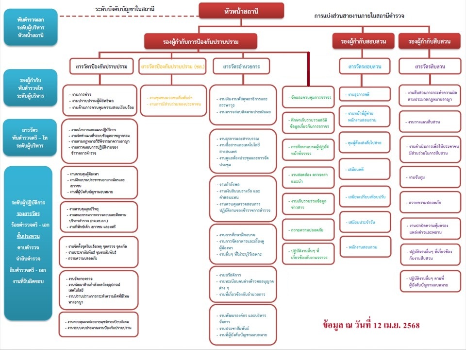 มีหน้าที่เกี่ยวกับการวางแผน อำนวยการ สั่งการ ควบคุม กำกับ ดูแล ตรวจสอบติดตามและประเมินผล ตลอดจนปฏิบัติงานในด้านการป้องกันอาชญากรรมและรักษาความสงบเรียบร้อยงานคณะกรรมการตรวจสอบและติดตามการบริหารงานตำรวจ งานชุมชนและมวลชนสัมพันธ์ในรูปแบบต่าง ๆ รวมทั้งงานที่มีลักษณะเกี่ยวข้องหรือเป็นส่วนประกอบของงานนี้ เพื่อมิให้เกิดอาชญากรรมขึ้นในเขตอำนาจ การรับผิดชอบหรือพื้นที่ปกครองของสถานีตำรวจ